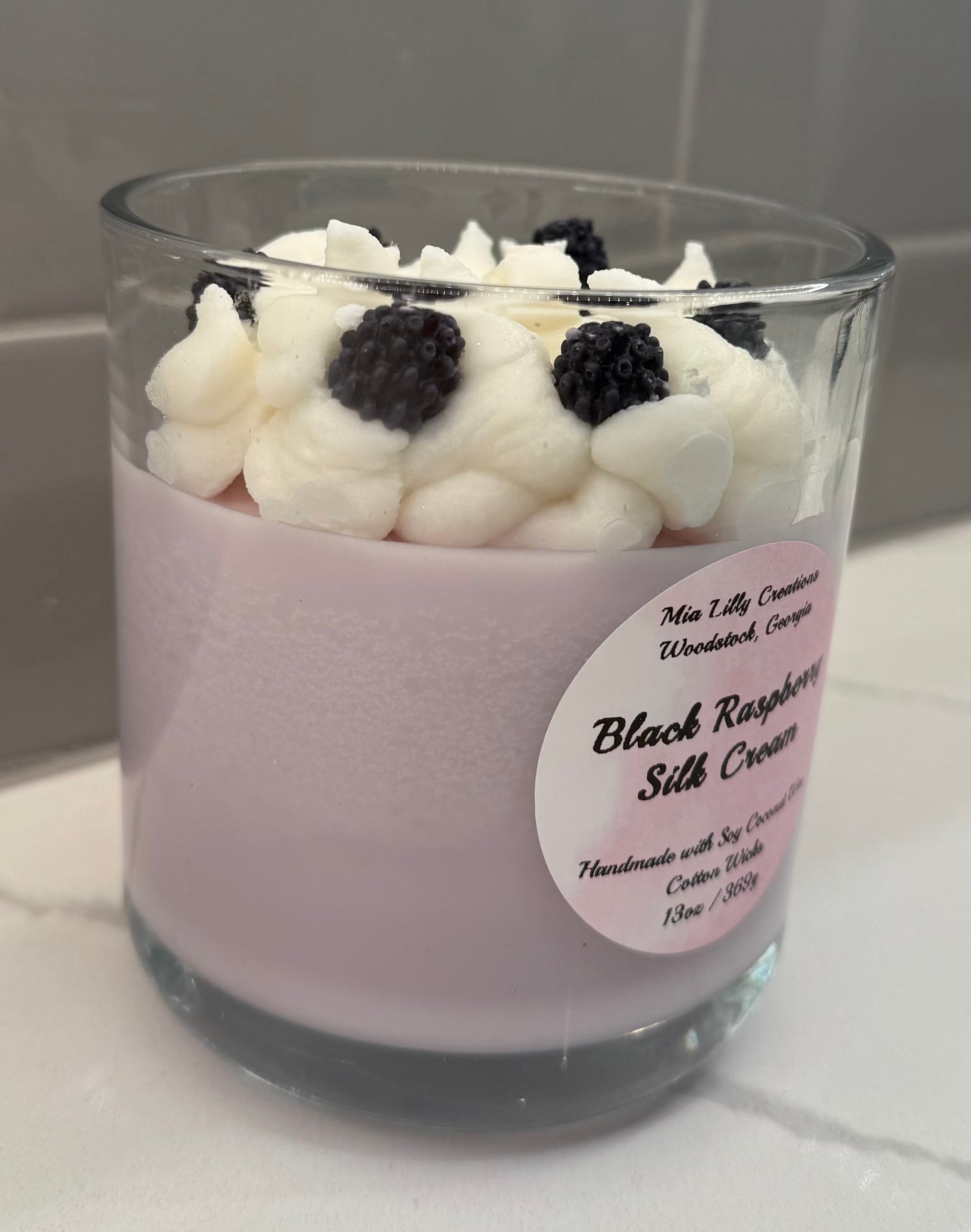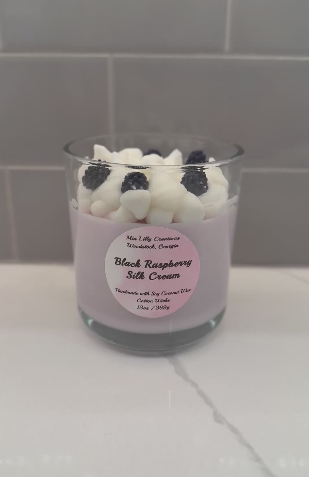 Fall in love with the sweet, creamy scent of juicy black raspberries swirled into silky whipped cream with our Black Raspberry Silk Cream candle. This luxurious showstopper from our XL candle line is not only a scent experience but a visual treat—topped with ultra-realistic whipped wax and hand-placed wax raspberries that look good enough to eat (but please don’t!).