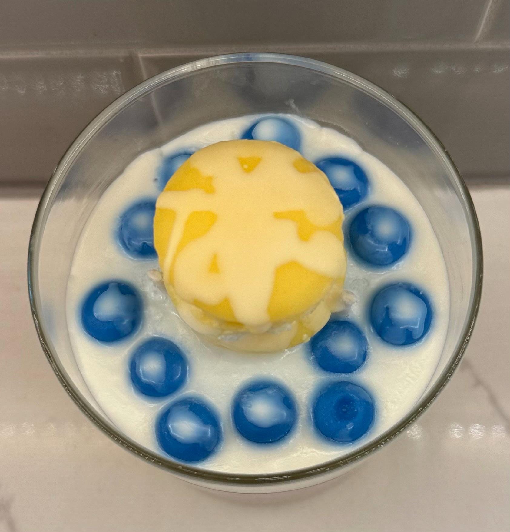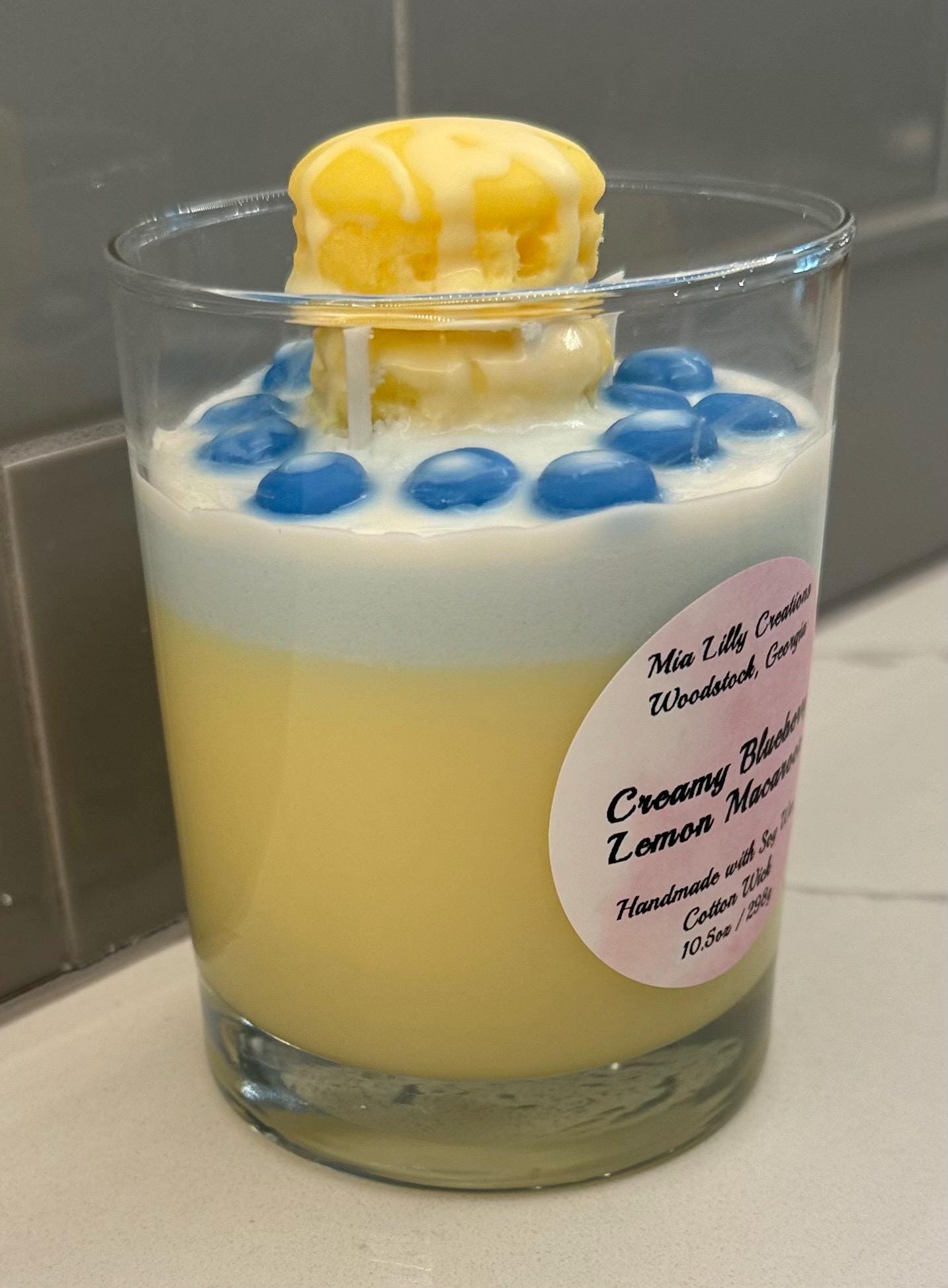 Elevate your space with the delectable scent of our Creamy Blueberry Lemon Macaroon Candle, handcrafted in Woodstock, Georgia. This 10.5oz soy candle blends the sweet burst of blueberries, the tangy zest of lemon, and the creamy richness of macaroon into a luxurious fragrance. Topped with handcrafted blueberry and lemon decorations, this handmade scented candle is a perfect fusion of bakery charm and elegant home decor.