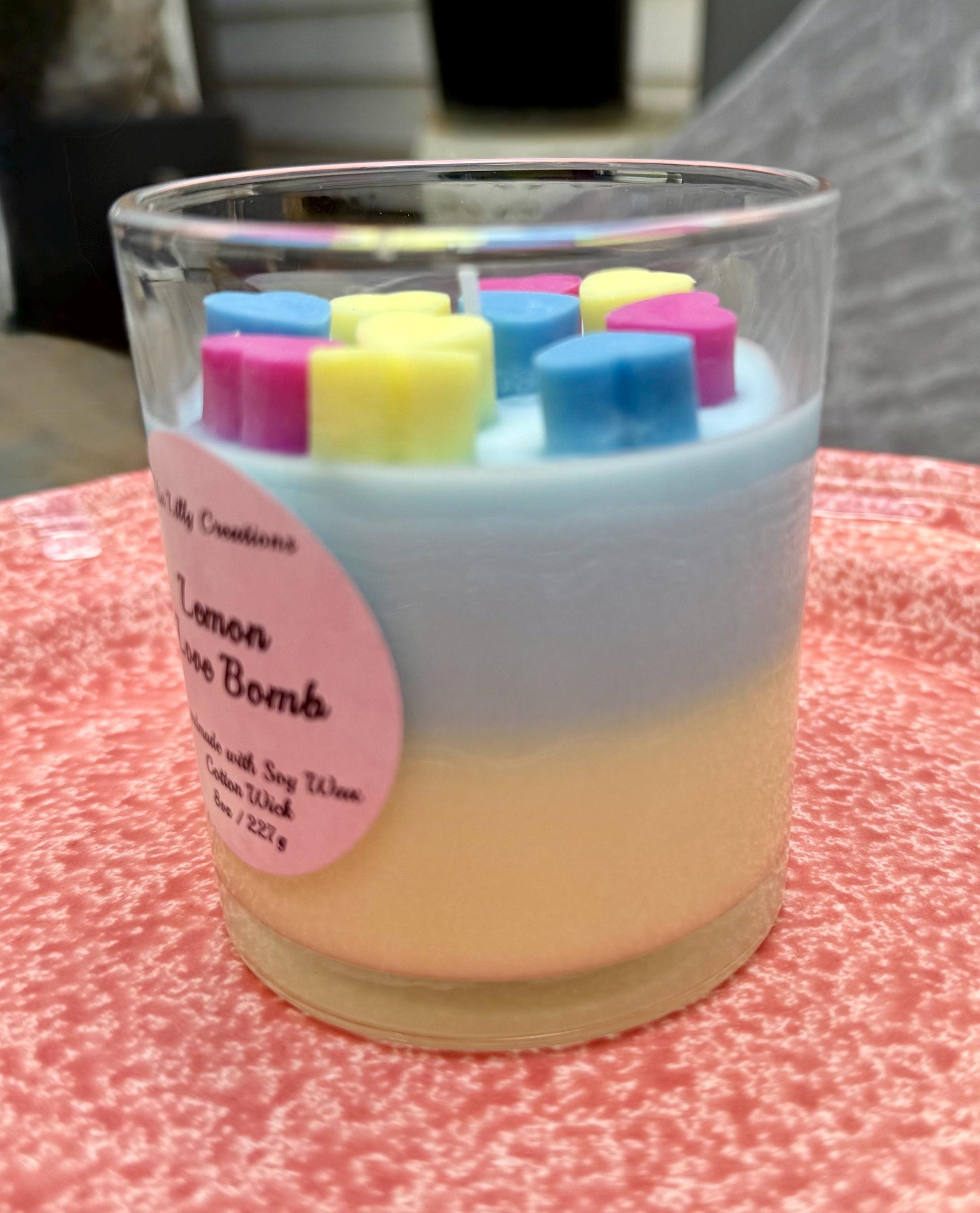 Brighten your space with the zesty and cheerful Lemon Love Bomb Soy Candle from Mia Lilly Creations! This handmade candle is crafted with premium soy wax and a natural cotton wick, delivering a clean, long-lasting burn. Infused with the refreshing scent of tangy lemon, this candle bursts with vibrant energy, perfect for uplifting your mood or creating a welcoming ambiance. Adorned with colorful heart-shaped wax embeds in shades of yellow, pink, blue, and purple, this candle adds a playful and love-filled touch to any room.