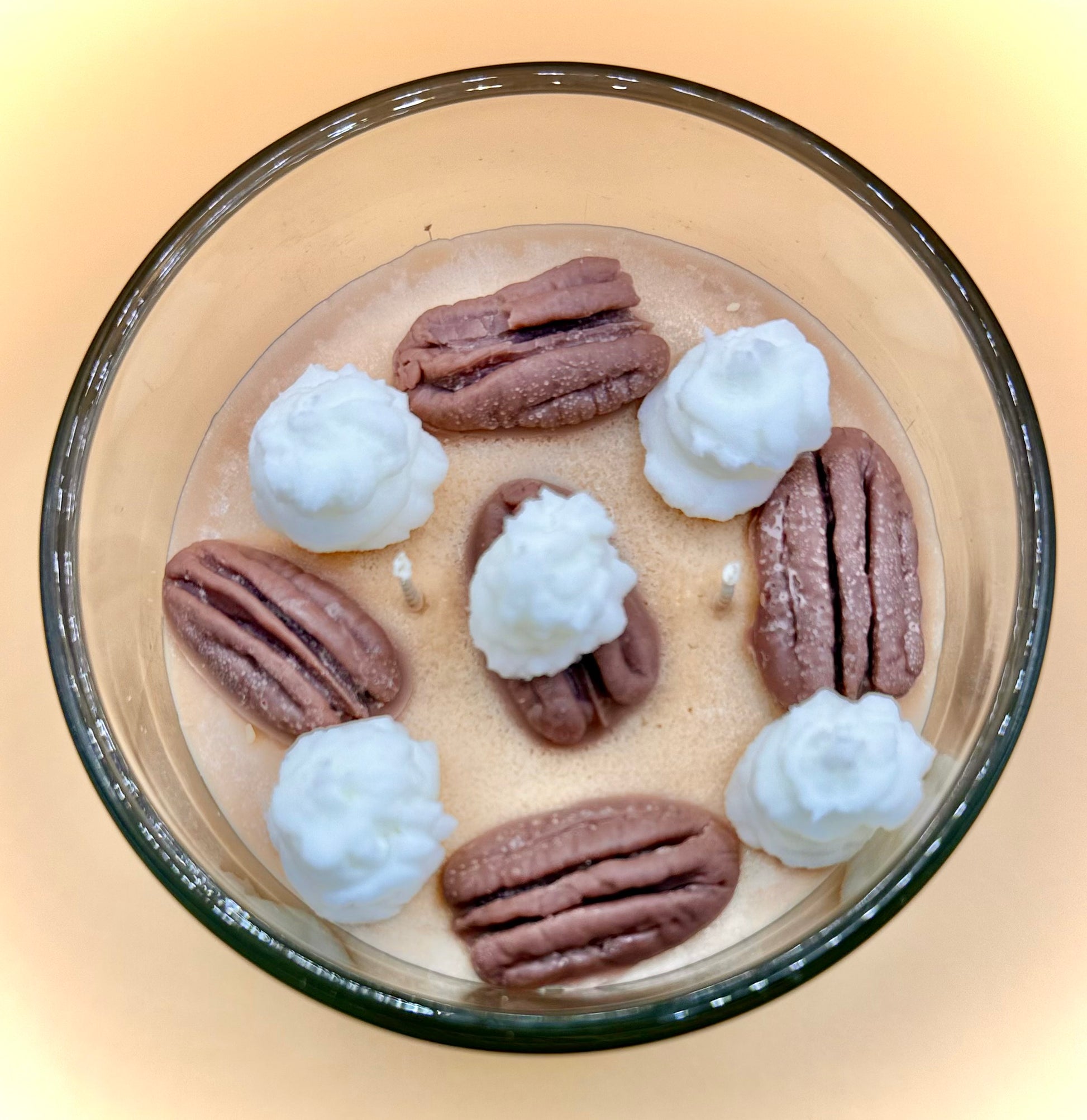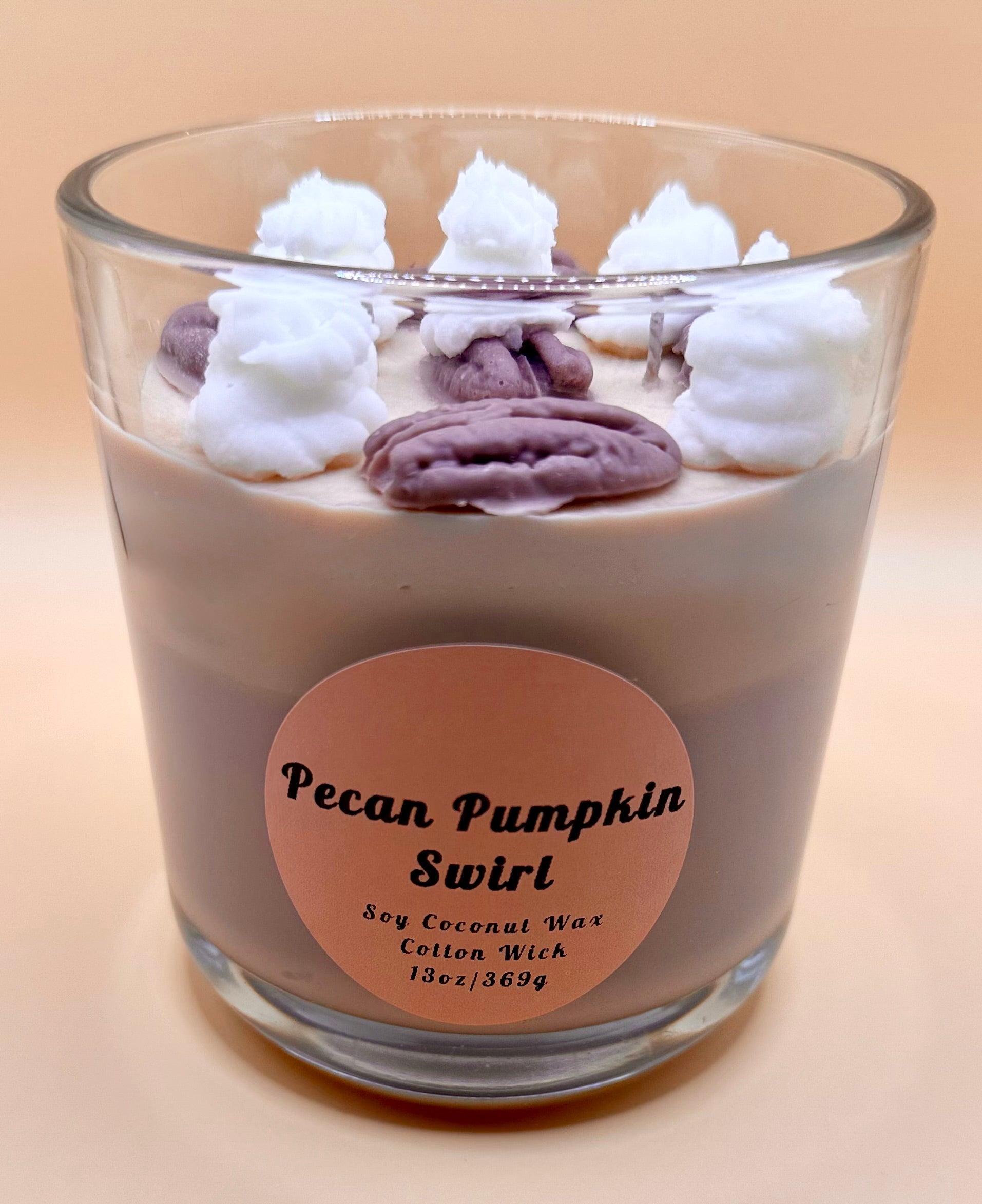 Indulge your senses in the sweetness of fall with our hand-poured Pecan Pumpkin Swirl Candle. This dessert-inspired candle is layered with warm pumpkin, roasted pecan, and creamy vanilla notes, finished with whipped “cream” wax topping and realistic wax pecans. Not only does it smell divine, but it also looks like a freshly baked autumn dessert straight out of the oven!
