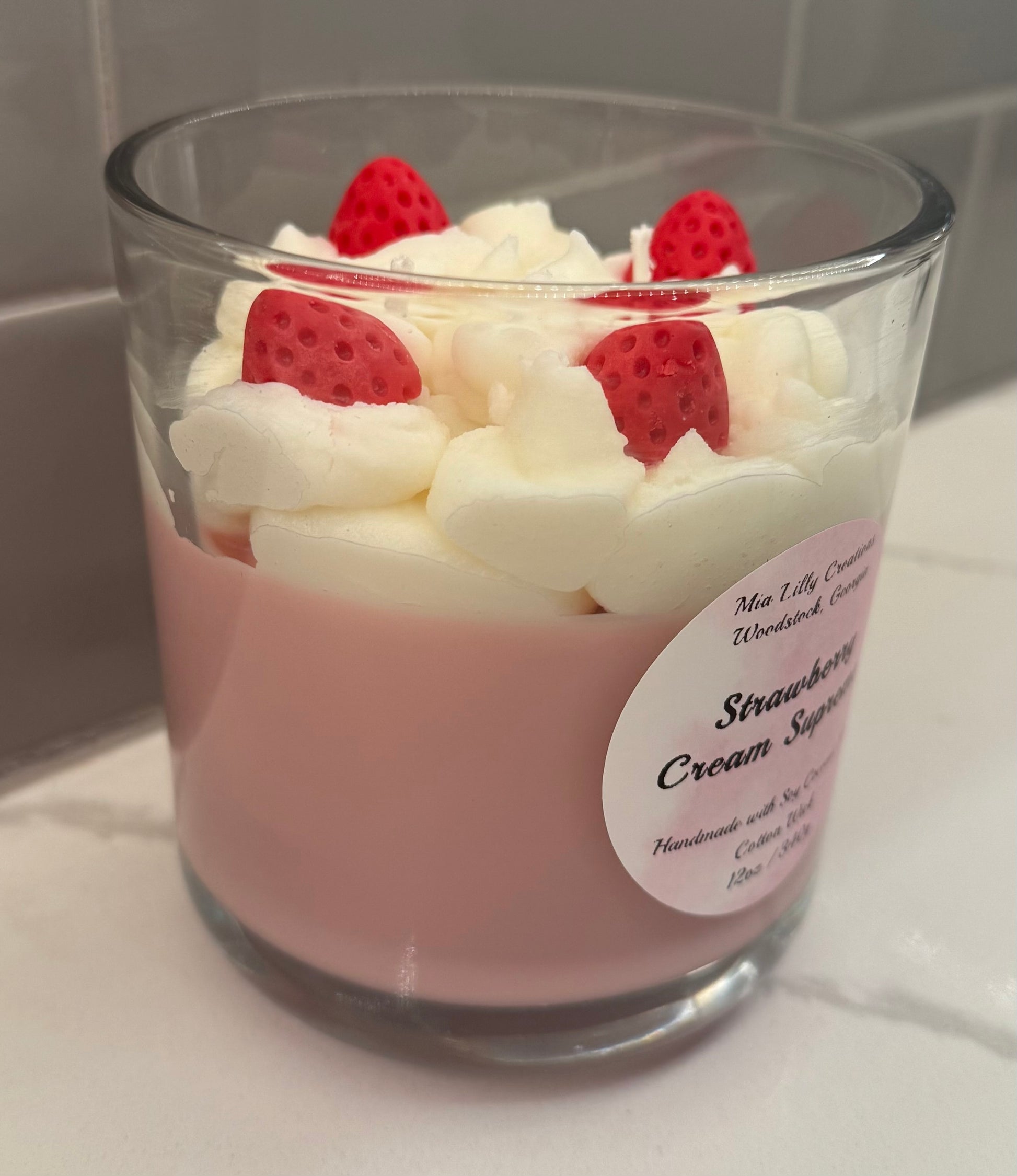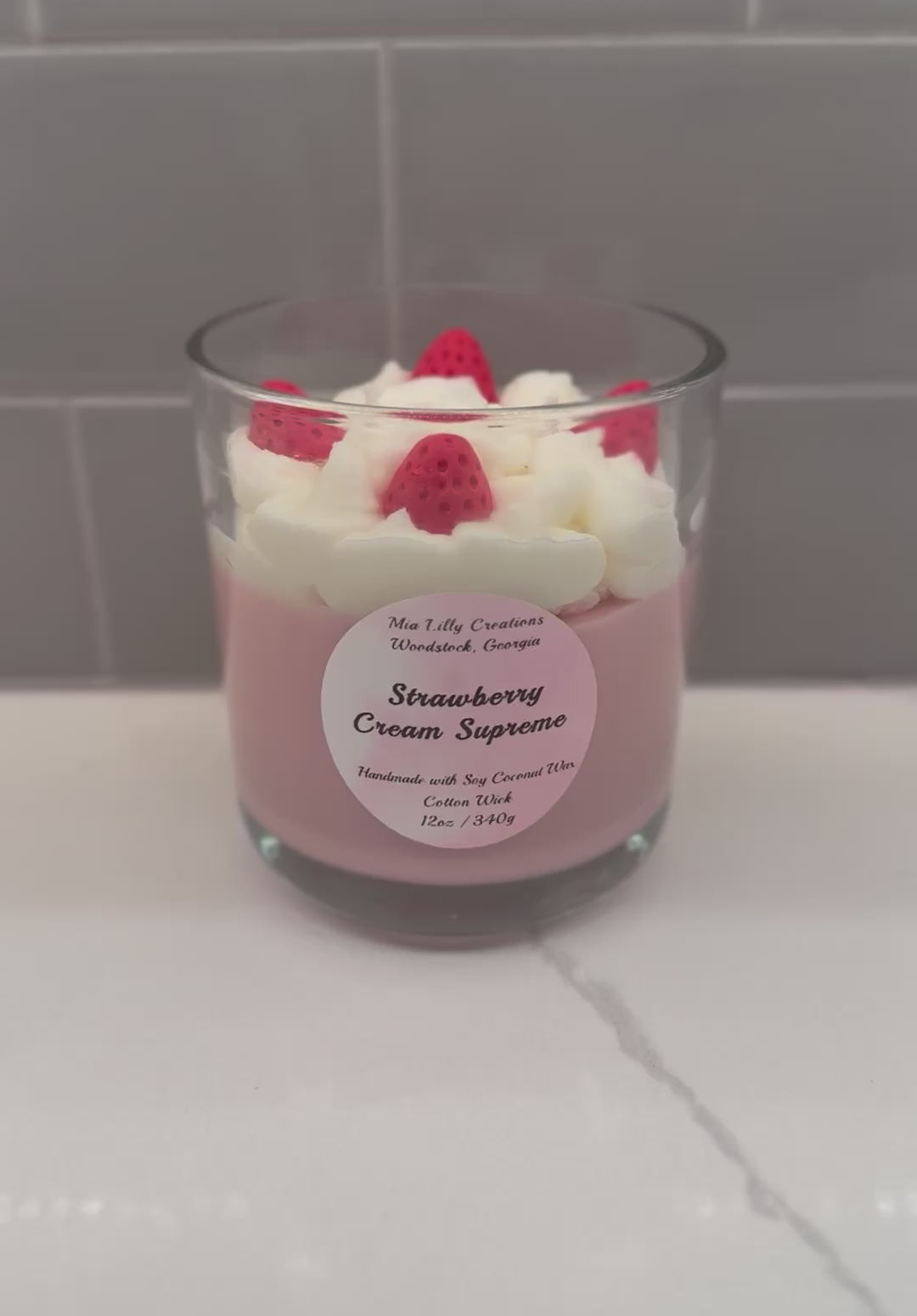 Indulge in the decadent aroma of fresh strawberries and rich cream cake with our Strawberry Cream Supreme Candle. Part of our XL candle line, this candle is a showstopper with its realistic whipped topping and hand-crafted strawberry wax embeds that look just like a gourmet dessert.